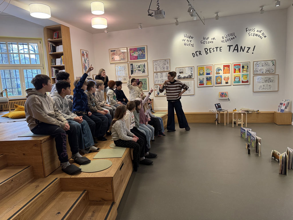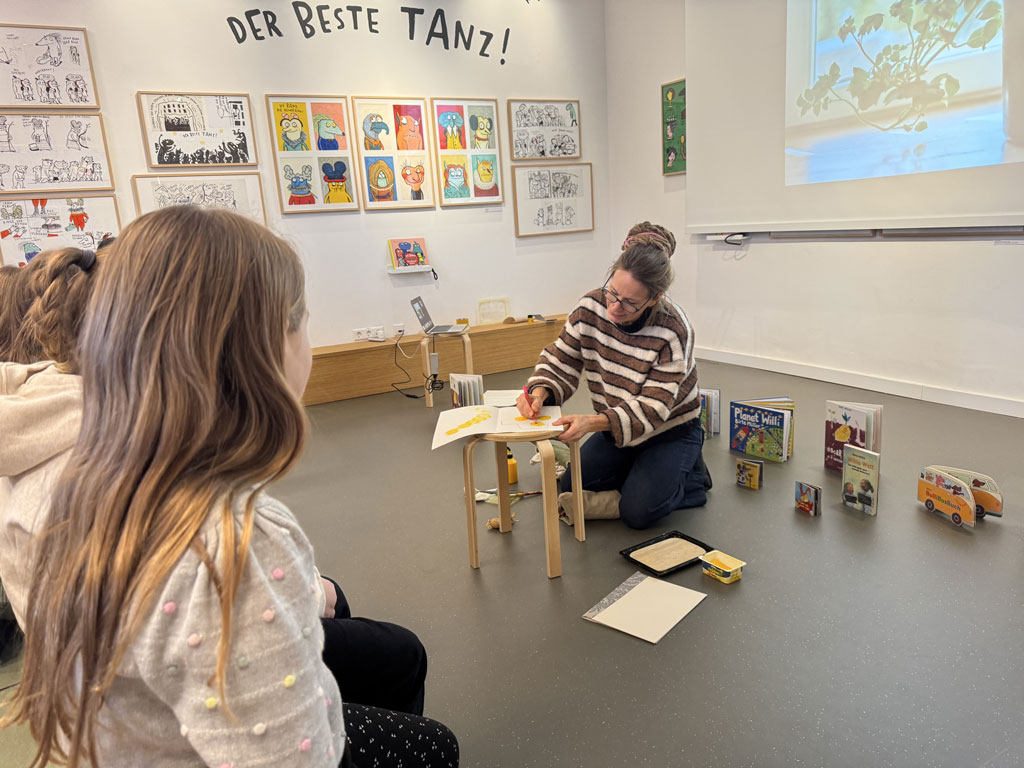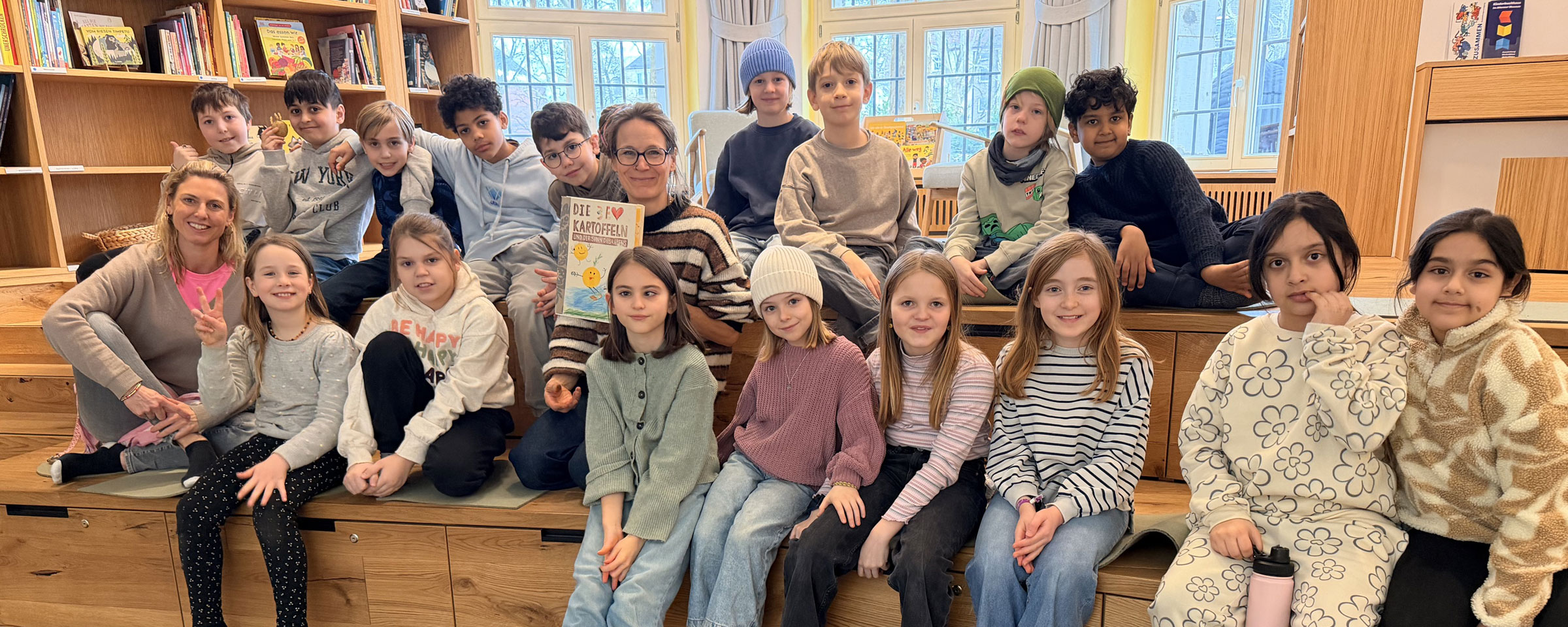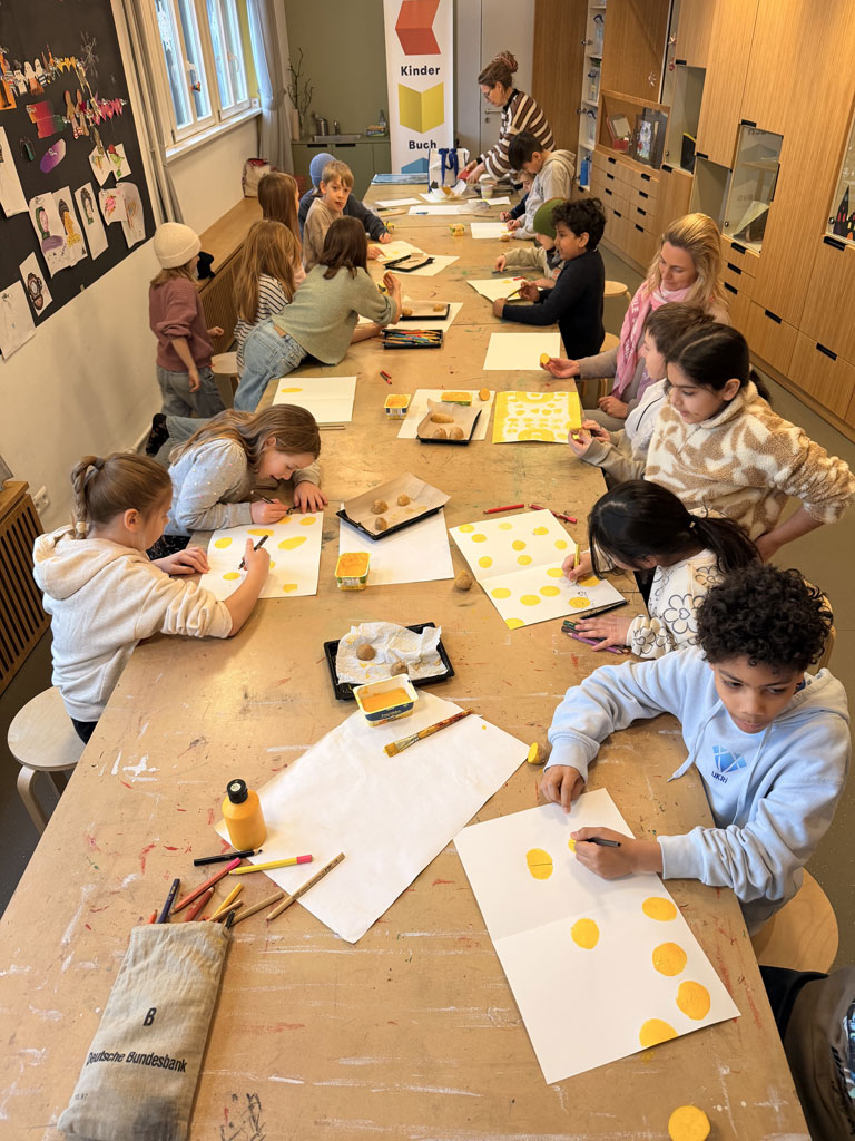 Am 02.02.26 war ich mit meiner Klasse 3e im Kinderbuchhaus. Die Bilderbuchkünstlerin Birte Müller hat uns zu einer Lesung ihres Buches „Die Kartoffel und der Sinn des Lebens“ eingeladen. Nach der Lesung konnten meine Schülerinnen und Schüler in einer Kartoffeldruck-Werkstatt gemeinsam ein Buch gestalten und sich kreativ auf die Suche nach dem Sinn des Lebens einer Kartoffel machen. Zuerst druckten die Kinder mit gelber Farbe und halbierten Kartoffeln große Punkte auf weiße Blätter. Anschließend wurden aus den Punkten mit Hilfe von Buntstiften lustige Gestalten: Es gab eine Speerwurf-Kartoffel, Kartoffeln, die verliebt waren, Kartoffeln, die Fußball spielten oder die auf der Toilette saßen. Alles war dabei und wir konnten ein tolles, selbst gebundenen Buch mit in die Schule zurück nehmen.