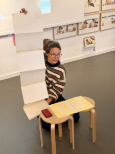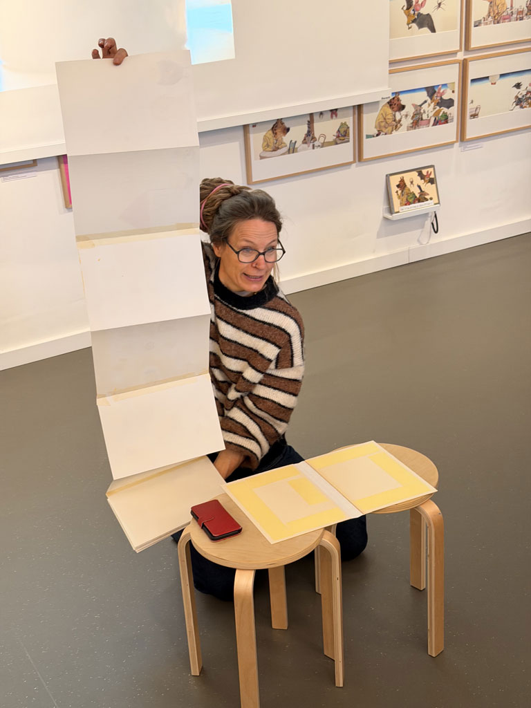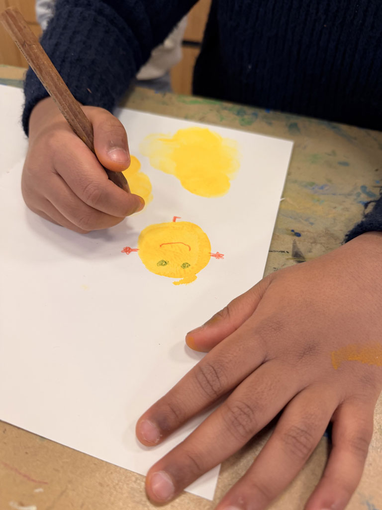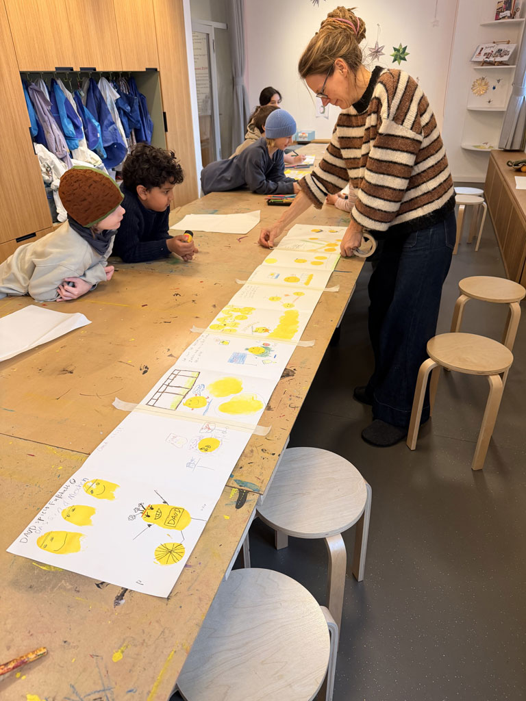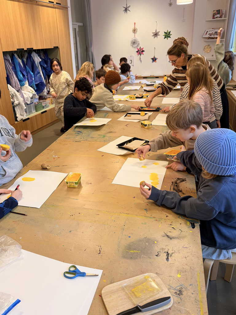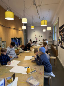Am 02.02.26 war ich mit meiner Klasse 3e im Kinderbuchhaus. Die Bilderbuchkünstlerin Birte Müller hat uns zu einer Lesung ihres Buches „Die Kartoffel und der Sinn des Lebens“ eingeladen. Nach der Lesung konnten meine Schülerinnen und Schüler in einer Kartoffeldruck-Werkstatt gemeinsam ein Buch gestalten und sich kreativ auf die Suche nach dem Sinn des Lebens einer Kartoffel machen. Zuerst druckten die Kinder mit gelber Farbe und halbierten Kartoffeln große Punkte auf weiße Blätter. Anschließend wurden aus den Punkten mit Hilfe von Buntstiften lustige Gestalten: Es gab eine Speerwurf-Kartoffel, Kartoffeln, die verliebt waren, Kartoffeln, die Fußball spielten oder die auf der Toilette saßen. Alles war dabei und wir konnten ein tolles, selbst gebundenen Buch mit in die Schule zurück nehmen.