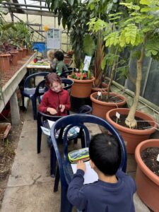 Anschließend konnten wir frühstücken und uns dann eine Pflanze im Gewächshaus oder in einem botanischen Buch aussuchen und abzeichnen. Frau Harzer hatte Papier und ganz viele Stifte mitgenommen. Bevor wir mit dem Bus wieder zurück zur Schule fuhren, durften wir ca. eine Stunde auf den Wiesen des botanischen Gartens toben und spielen.
