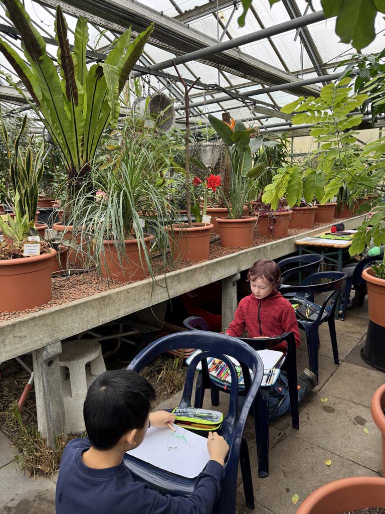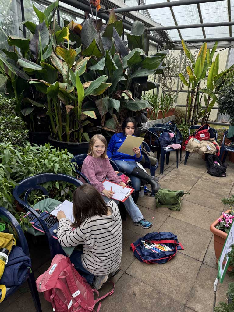 Anschließend konnten wir frühstücken und uns dann eine Pflanze im Gewächshaus oder in einem botanischen Buch aussuchen und abzeichnen. Frau Harzer hatte Papier und ganz viele Stifte mitgenommen. Bevor wir mit dem Bus wieder zurück zur Schule fuhren, durften wir ca. eine Stunde auf den Wiesen des botanischen Gartens toben und spielen.